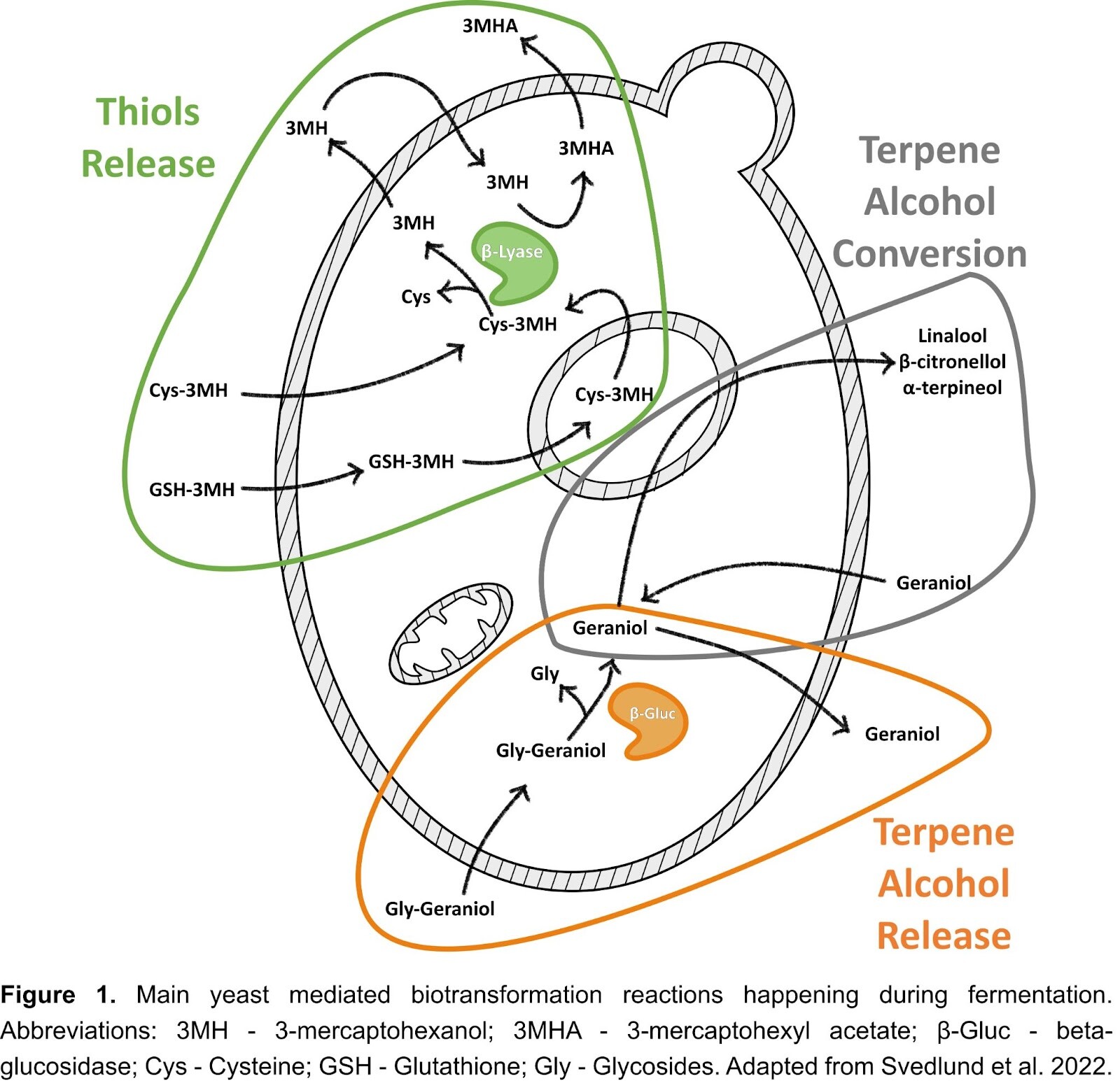 最終的なビールへのバイオトランスフォーメーションの主な寄与は、モノテルペンアルコール(monoterpene alcohols)やチオール(thiols)のようなフレーバー活性分子の非芳香族前駆体からの放出で、イースト符号化された2つの酵素、βグルコシダーゼ(β-glucosidase)とβリアーゼ(β-lyase)によって行われる。ゲラニオール(geraniol)やリナロール(linalool)のような、ホップ由来の異なるテルペンアルコール間の変換も最終製品のフレーバープロファイルに適度に寄与する。完全には解明されていないが、このプロセスも酵素が介在していると考えられている。